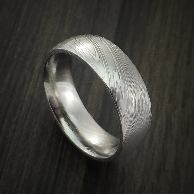 Celebrate timeless strength and modern craftsmanship with this custom-made Damascus Steel men’s wedding band, featuring a sleek polished finish that showcases the steel’s signature flowing grain pattern.